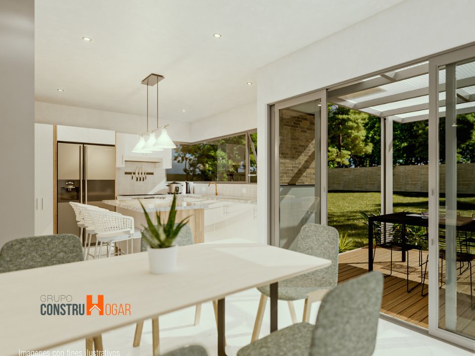 Se trabaja el diseño de la casa en una sola planta con un estilo muy clásico, enchapes tipo ladrillo y con varias caídas de techos. Todos los espacios cuentan con amplios ventanales generando en todos los aposentos iluminación y ventilación natural.