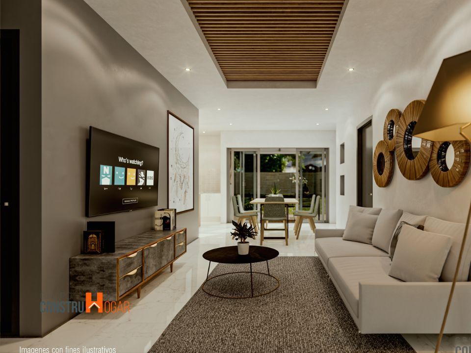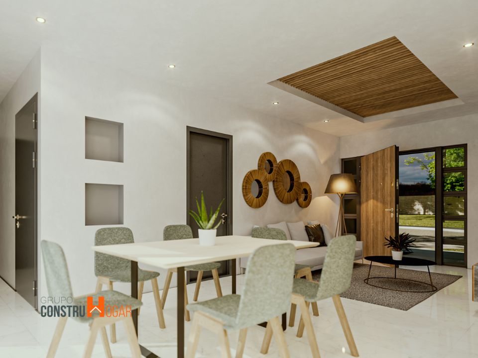 PRIMER NIVEL: Entrada principal, baño completo, lavandería, cocina, sala-comedor, dormitorio secundario 1, terraza, cochera para dos vehículos, dormitorio principal con WC, baño completo. La casa EIKA se diseña para ser construida en el condominio Montezuma en Grecia.